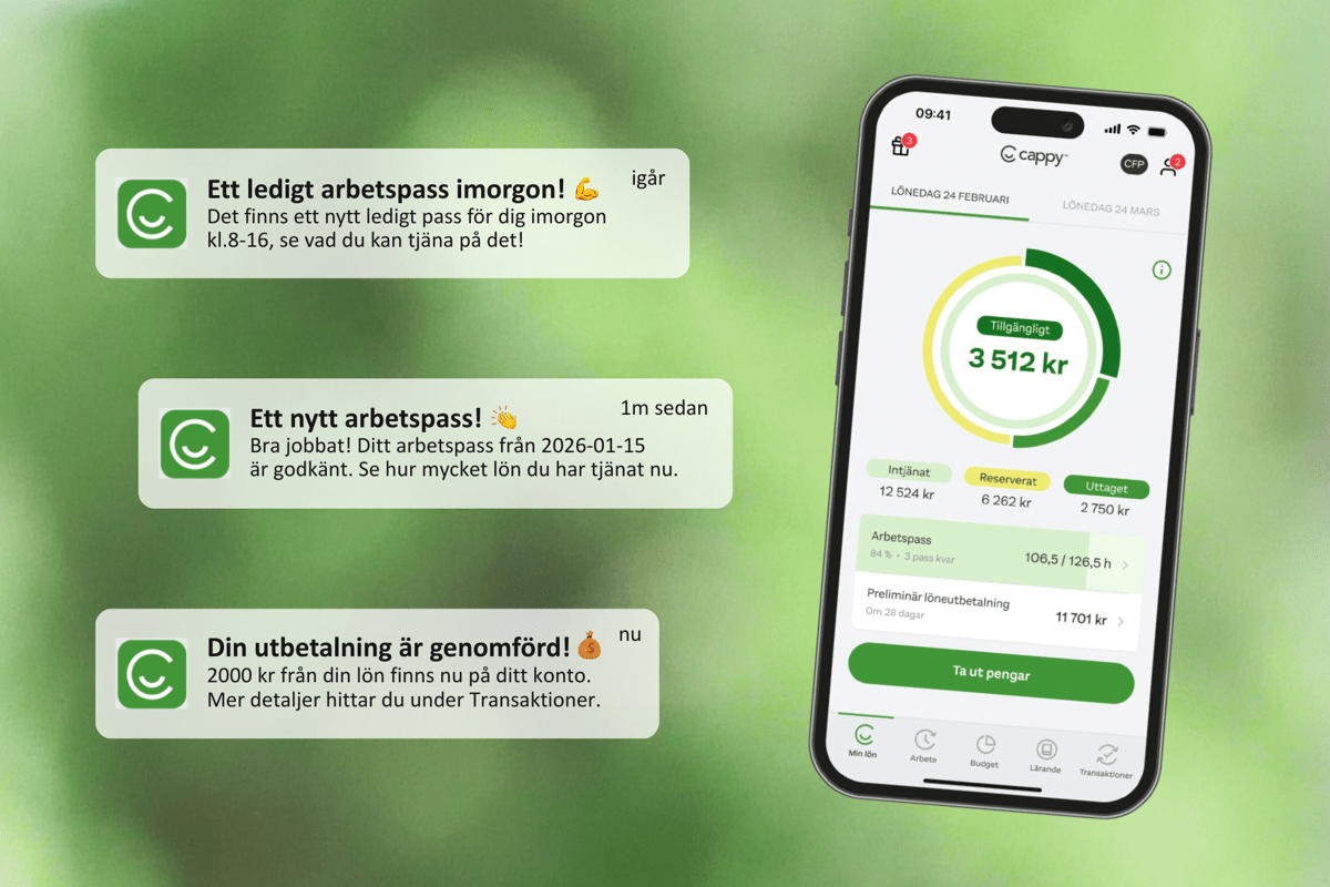 Som medarbetare hos oss får du tillgång till Cappy – en smart app som ger dig en överblick över din arbetstid och lön. I appen kan du till exempel se arbetad tid, intjänad lön, preliminär löneutbetalning, information om lediga arbetspass och hur mycket du kan tjäna på ett extrapass. Med Cappy finns även möjlighet att ta ut del av intjänad lön för extrapass/timpass direkt efter avslutat pass.